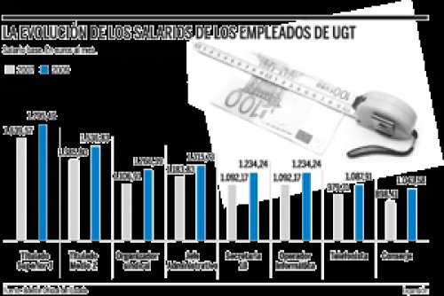 Según el convenio colectivo del personal laboral de UGT, que estará en vigor hasta el 31 de diciembre de 2011, los empleados de esta central sufrirán subidas salariales este año y el próximo superiores al 1,75%, a lo que habría que sumar el objetivo oficial de inflación, del 2%.