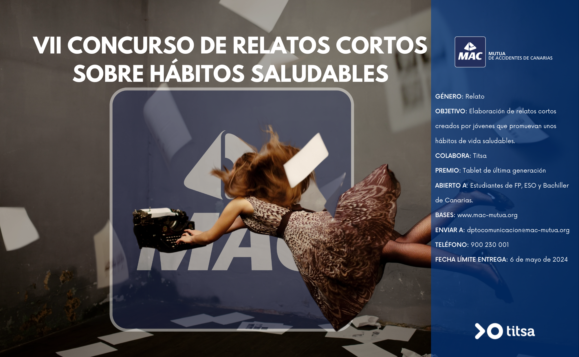 La Mutua de Accidentes de Canarias (MAC), a través de su comisión de Responsabilidad Social Corporativa (RSC), convoca su VII Concurso de Relatos Cortos sobre Hábitos Saludables. El objetivo de esta iniciativa es fomentar entre la ciudadanía la importancia de desarrollar una vida sana. La convocatoria está abierta al alumnado de ESO, FP y Bachiller de los centros canarios (jóvenes entre 12 y 18 años), que recibirán las bases del concurso (que pueden consultarse, asimismo, en la web de esta entidad colaboradora con la Seguridad Social: www.mac-mutua.org).