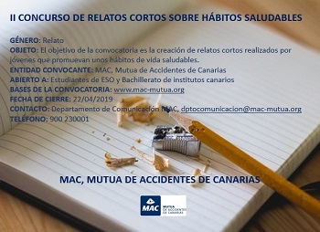 La Mutua de Accidentes de Canarias (MAC), a través de su comisión de Responsabilidad Social Corporativa (RSC), convoca su II Concurso de Relatos Cortos sobre Hábitos Saludables. El objetivo de esta iniciativa es fomentar entre la ciudadanía la importancia de desarrollar una vida sana. La convocatoria está abierta al alumnado de ESO y Bachiller de los institutos canarios (jóvenes entre 12 y 18 años). Todos los centros del Archipiélago han recibido las bases del concurso (que pueden consultarse en nuestra web: www.mac-mutua.org).