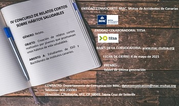 La Mutua de Accidentes de Canarias (MAC), a través de su comisión de Responsabilidad Social Corporativa (RSC), convoca su IV Concurso de Relatos Cortos sobre Hábitos Saludables. El objetivo de esta iniciativa es fomentar entre la ciudadanía la importancia de desarrollar una vida sana. La convocatoria está abierta al alumnado de ESO y Bachiller de los institutos canarios (jóvenes entre 12 y 18 años). Todos los centros del Archipiélago han recibido hoy las bases del concurso (que pueden consultarse en la web de esta entidad colaboradora con la Seguridad Social: www.mac-mutua.org).