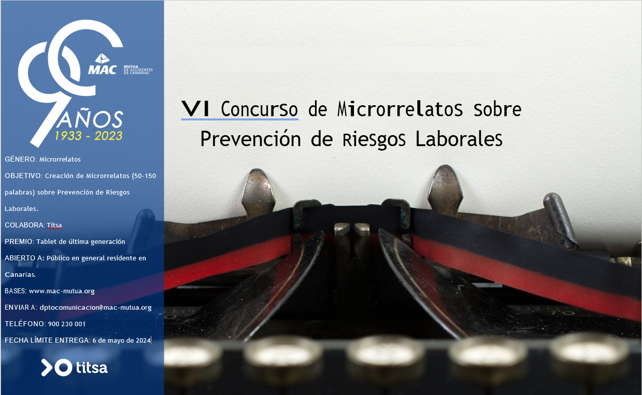 La Mutua de Accidentes de Canarias (MAC), con el apoyo de la empresa de Transportes Interurbanos de Tenerife, SA (TITSA), lanza su sexto concurso de microrrelatos sobre Prevención de Riesgos Laborales. Esta acción se une a la ya puesta en marcha hace siete años: el concurso de relatos cortos sobre hábitos saludables, dirigido a estudiantes de ESO, FP y Bachiller de Canarias.