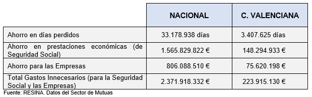 A nivel nacional, si las Mutuas pudieran prestar una asistencia sanitaria integral y gestionar administrativamente con todas las facultades los procesos de baja laboral por Contingencias Comunes diagnosticados como procesos traumatológicos, se podría recuperar la salud de los trabajadores que las padecen en la mitad de tiempo y obtener un ahorro económico superior a los 2.370 millones de euros. En la Comunidad Valenciana este ahorro supondría más de 223 millones de euros.