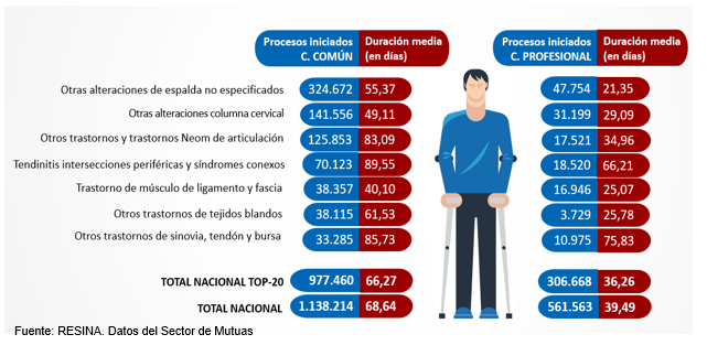 Existe una sustancial diferencia de tiempo en la recuperación de la salud de los trabajadores cuando las bajas que son diagnosticadas como patologías traumatológicas son tramitadas a través de los Servicios Públicos de Salud de las Comunidades Autónomas respecto a cuando estas mismas patologías son tratadas por las Mutuas colaboradoras con la Seguridad Social. En el siguiente grafismo se muestran los datos de los procesos iniciados de las patologías traumatológicas, así como la duración media de estos procesos. A la izquierda las derivadas de Contingencias Comunes, con procesos tramitados por los Servicios Públicos de Salud de las Comunidades Autónomas; y a la derecha la duración de los procesos de baja laboral cuando tienen origen en accidente de trabajo o enfermedad profesional, y la asistencia sanitaria a los trabajadores es prestada por las Mutuas colaboradoras con la Seguridad Social: