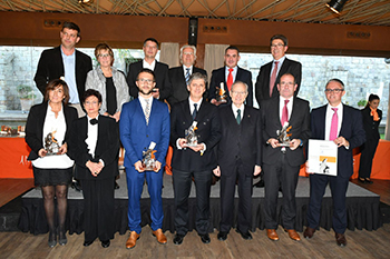 En la fotografía, los premiados, junto a la directora del Institut Català de Seguretat i Salut Laboral, Elena Juanola; el director del Centro Nacional de Condiciones del Trabajo, Joan Guasch; el director general de MC MUTUAL, Eduardo Vidal (en la fila superior) y Mª Lluïsa Casals, viuda de don Antonio Baró; y el presidente de MC MUTUAL, Miquel Valls (fila inferior).