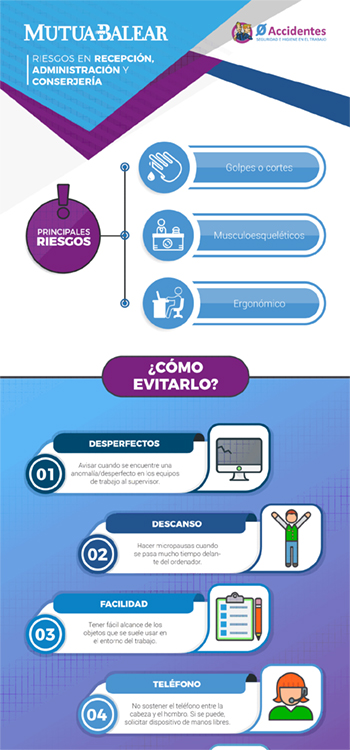 La colección de Infografías, bajo el lema "la prevención de un vistazo" es fácilmente identificable a través de un enlace específico situado en la web de Mutua Balear. Los primeros capítulos se han dedicado a la Hostelería y Restauración con consejos preventivos de Recepción y de Cocina. Todas las infografías se pueden descargar igualmente en PDF.