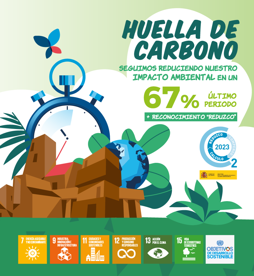El cálculo de la Huella de Carbono se ha realizado mediante la herramienta del Ministerio para la Transición Ecológica y el Reto Demográfico y ha sido verificado externamente, cumpliendo con los estándares de rigor y transparencia. Esta acción se enmarca en los Objetivos de Desarrollo Sostenible (ODS) 7, 9, 11, 12, 13 y 15.