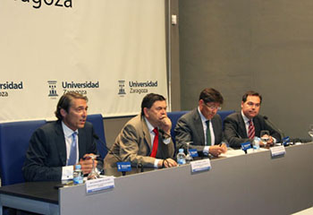 Guillermo de Vilchez, director gerente de MAZ, el rector de la Universidad de Zaragoza, Manuel Lopez Perez y el presidente del Instituto Aragones de Fomento (IAF), Arturo Aliaga, han firmado esta manana un acuerdo de colaboracion que servira para unir esfuerzos y abrir nuevas vias de investigacion en biomecanica, con el objetivo de evitar, prevenir y tratar lesiones y muertes producidas por impactos en el cuerpo humano.