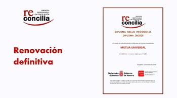 Mutua Universal, mutua colaboradora con la Seguridad Social, ha conseguido en el último trimestre de 2020 la renovación definitiva del sello “Reconcilia”, otorgado por el Gobierno de Navarra y de carácter bianual. La Entidad obtuvo por primera vez este reconocimiento en 2016, lo renovó en 2018 y en noviembre de 2020 ha conseguido la renovación con carácter definitivo.