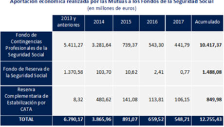 Fuente: AMAT Las Mutuas colaboradoras con la Seguridad Social acumulan una aportacion historica a los fondos de la Seguridad Social de mas de 12.755 millones de euros La gestión realizada durante 2017 por las Mutuas colaboradoras con la Seguridad Social ha supuesto, una vez cubiertas las reservas correspondientes, un excedente de 548,71 millones de euros