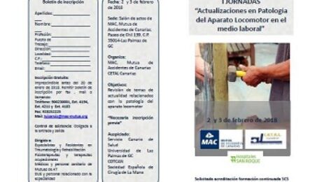 Fuente: MAC La Mutua de Accidentes de Canarias (MAC) organiza, junto a CETAL Canarias y Hospitales San Roque, los dias 2 y 3 de febrero en su sede de Las Palmas de Gran Canaria (Paseo de Chil, 139) las I Jornadas «Actualizaciones en patologia de aparato locomotor en el medio laboral». Para asistir a estas