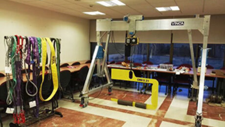 Fuente: Fremap Para el desarrollo de este Taller, el equipo tecnico de FREMAP ha disenado un portico de aluminio desmontable con carro manual al que se ha incorporado un polipasto monofasico de cadena, que permite simular operaciones de elevacion a pequena escala. Recientemente se ha incluido en la programación de talleres que FREMAP ofrece a