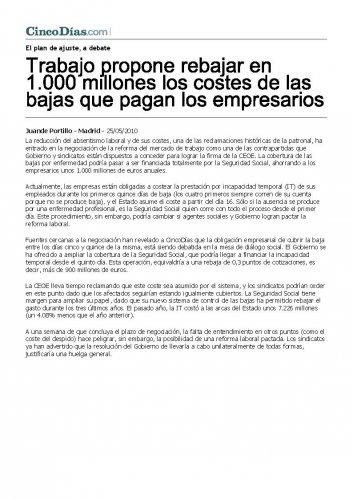 Fuentes cercanas a la negociación han revelado a CincoDías que la obligación empresarial de cubrir la baja entre los días cinco y quince de la misma, está siendo debatida en la mesa de diálogo social. El Gobierno se ha ofrecido a ampliar la cobertura de la Seguridad Social, que podría llegar a financiar la incapacidad temporal desde el quinto día. Esta operación, equivaldría a una rebaja de 0,3 puntos de cotizaciones, es decir, más de 900 millones de euros.