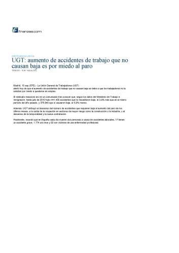 Además, UGT atribuyó el descenso del número de accidentes que requieren baja al aumento del paro de los últimos meses, a la caída de la ocupación en sectores de mayor riesgo como la construcción o la industria, y al descenso de la temporalidad y la nueva contratación.