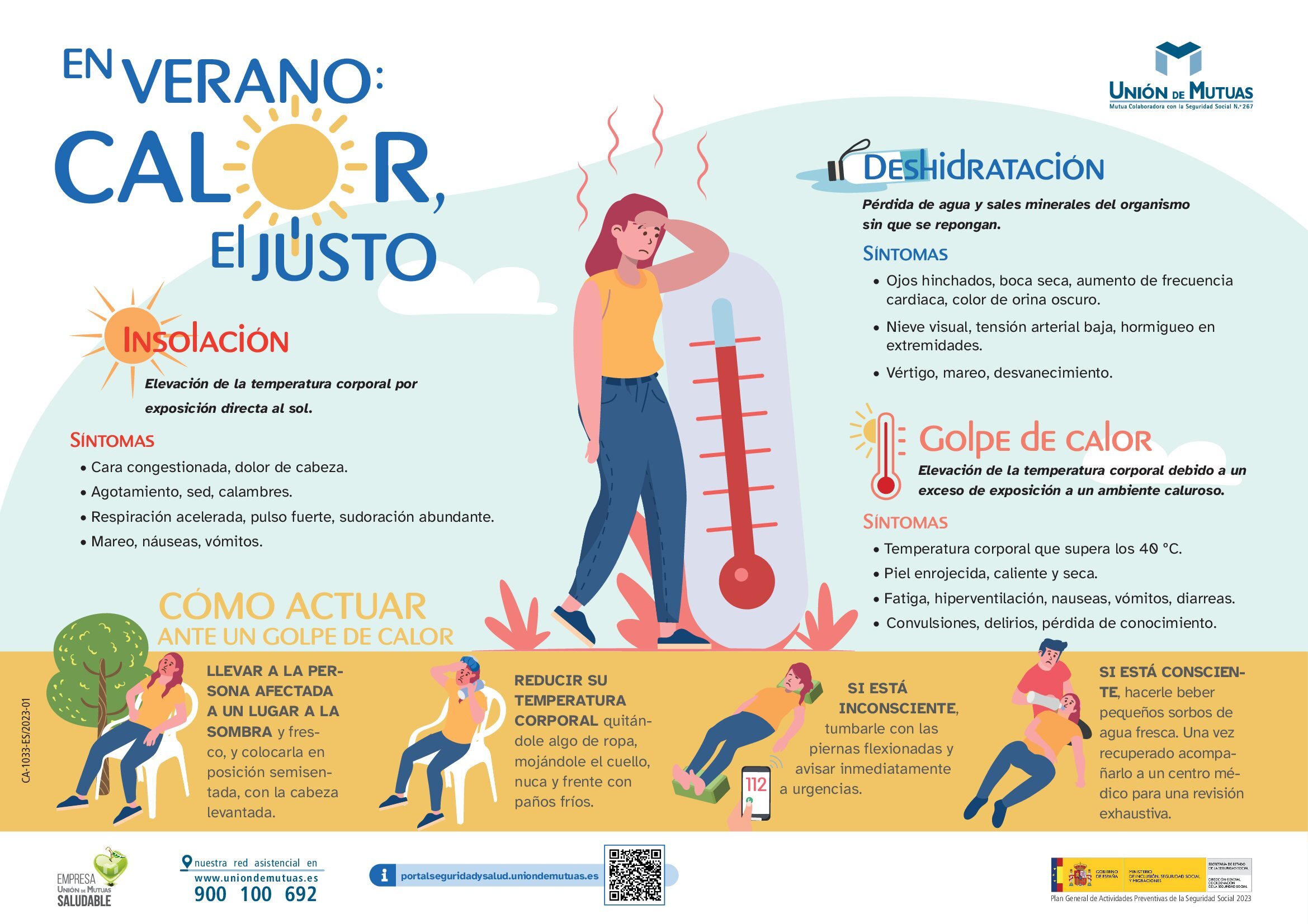 Unión de Mutuas, con el objetivo de concienciar sus trabajadores protegidos, autónomos adheridos y empresas asociadas, ha publicado todos los materiales de la campaña en su Portal de Seguridad y Salud. Estos carteles recogen consejos y recomendaciones para prevenir los riesgos derivados del calor, como pueden ser la deshidratación, la insolación o el golpe de calor. También se comparten otros enlaces y documentos de interés publicados por el Ministerio de Sanidad.