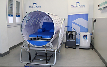 Unión de Mutuas acaba de poner en marcha, en su centro hospitalario de Castellón, la Unidad de Medicina Hiperbárica, una terapia no invasiva, sin efectos secundarios, por el que los pacientes, ubicados en una cámara presurizada, reciben oxígeno en una concentración cercana al 100% a una presión de 1’40 atmósferas.
