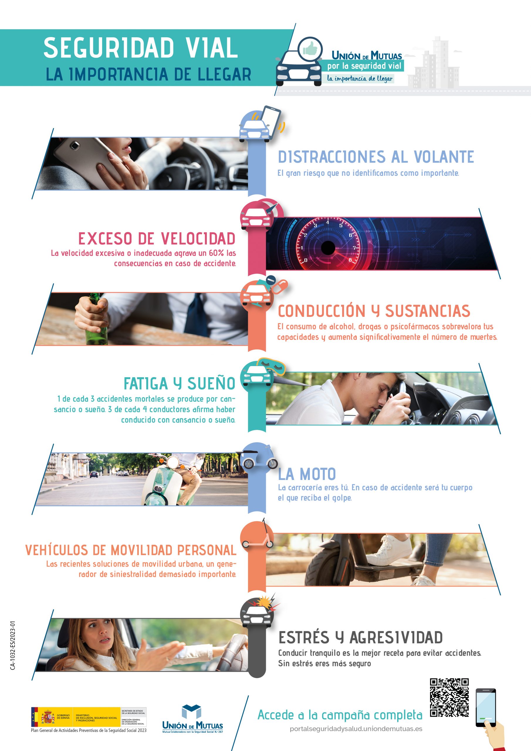 En la tarea de sensibilizar y fortalecer el comportamiento consciente en torno a la seguridad vial y la prevención de accidentes, Unión de Mutuas, en su Portal de Seguridad y Salud, pone a disposición de las empresas asociadas y autónomos adheridos, además de los materiales de la campaña “La importancia de llegar” numerosos recursos para que los trabajadores y trabajadoras de las empresas adopten buenos hábitos en seguridad vial.